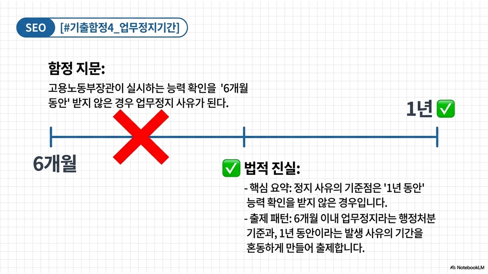 - [최다 빈출 함정] 고용노동부장관이 실시하는 능력 확인을 '1년 동안' 받지 않은 경우 업무정지 사유가 됩니다. 시험에서는 이를 '6개월'로 살짝 바꿔서 출제하니 절대로 속지 마십시오.