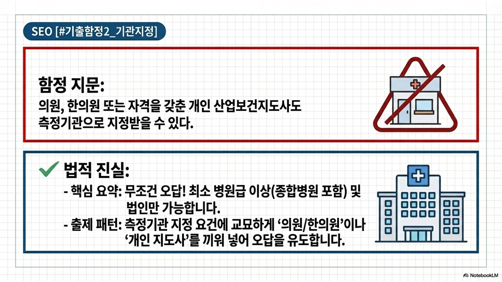 - [정답 포인트] 반드시 병원급 이상 또는 법인이어야 합니다. 개인 자격의 지도사는 기관으로 지정받을 수 없다는 논리를 기억하십시오.