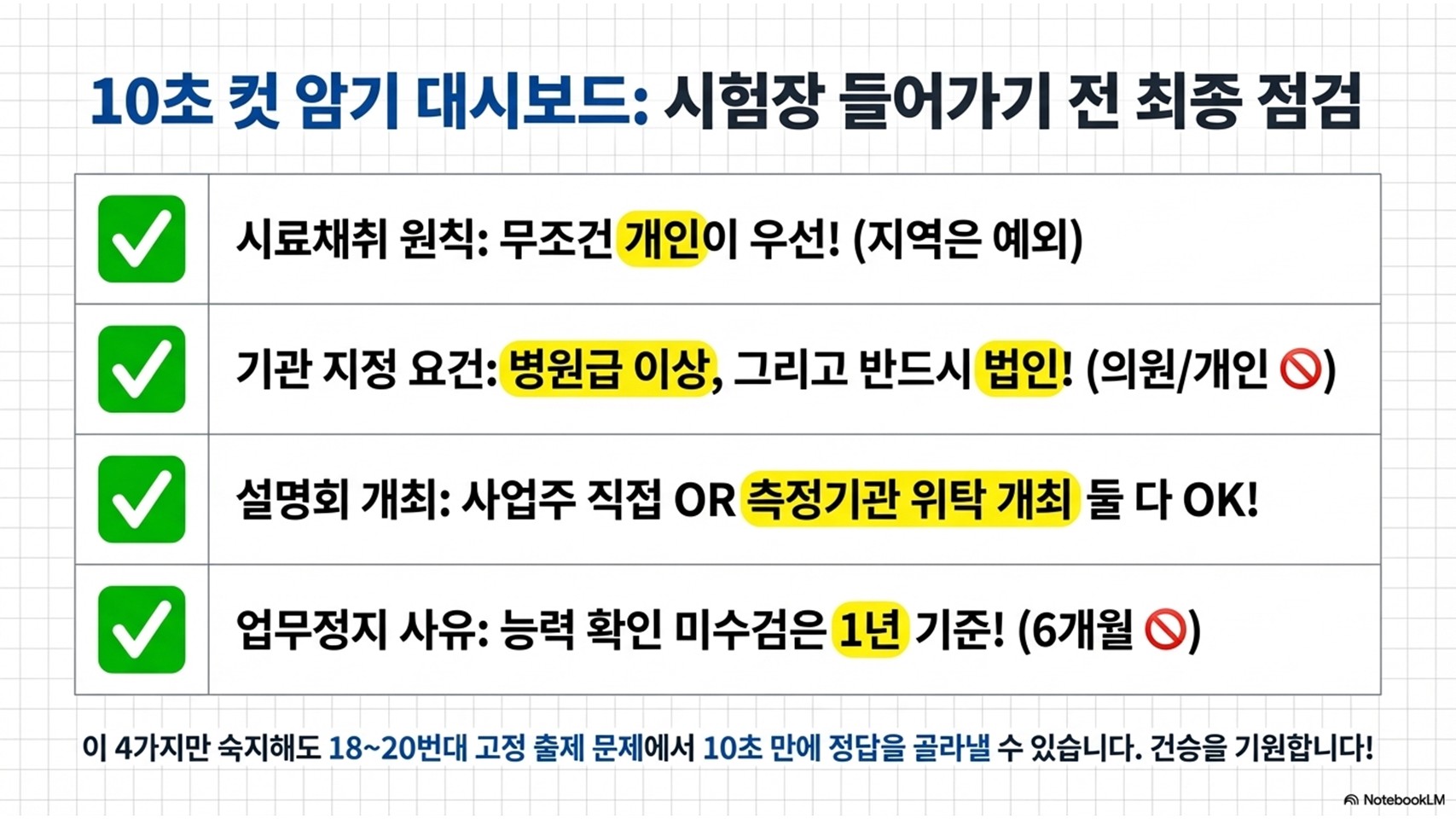 '작업환경측정' 파트는 법령의 텍스트를 얼마나 정밀하게 읽어내느냐의 싸움입니다. 특히 오늘 강조한 **'개인 시료채취 원칙', '병원급 이상 자격', '1년 주기 능력 확인'**은 매년 형태만 바꿔서 나오는 단골 손님들입니다.