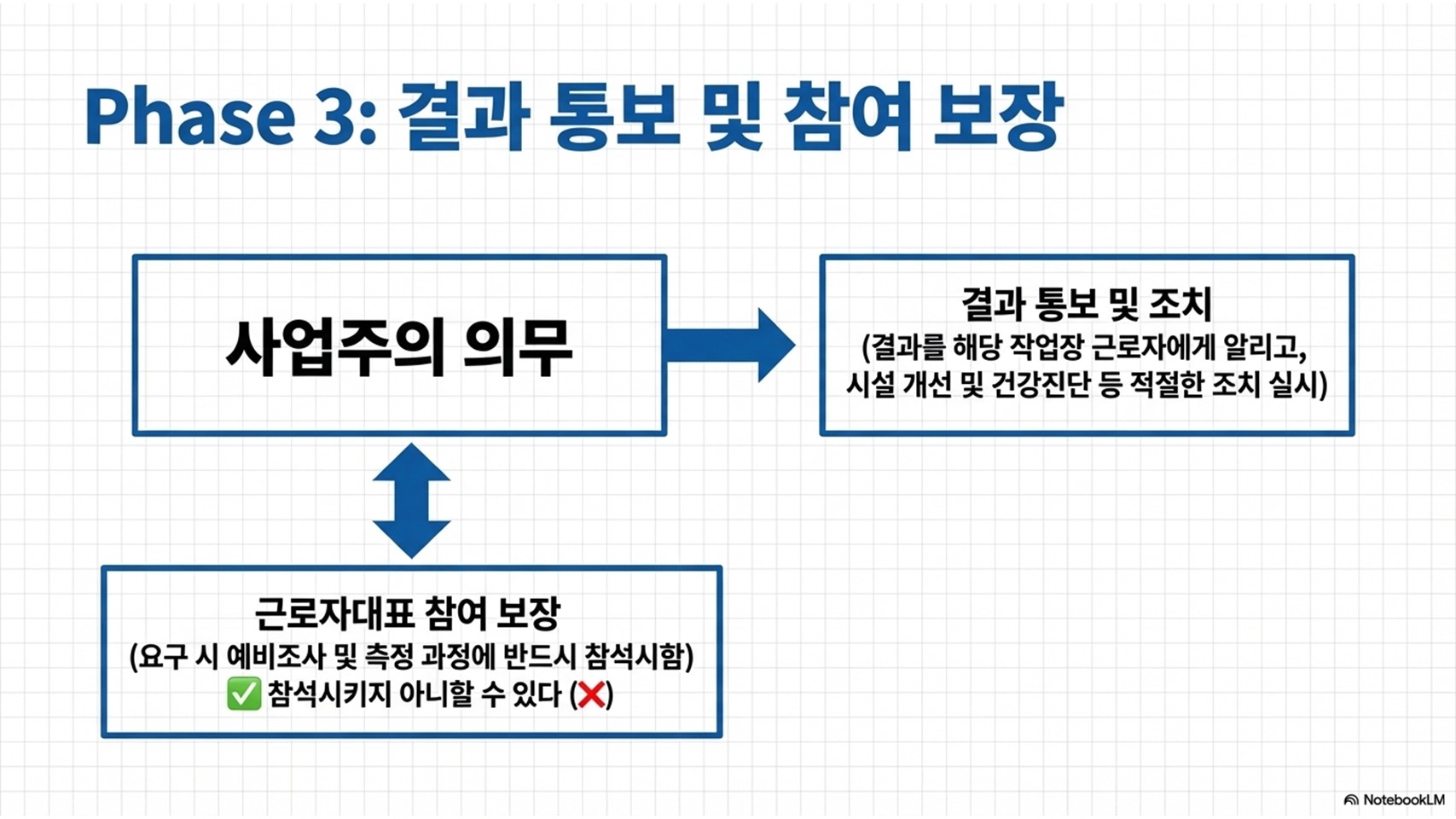 - 근로자대표의 참여권 (강력 강조): 사업주는 근로자대표가 요구할 경우 '본격적인 측정'뿐만 아니라 '예비조사' 단계부터 반드시 참석시켜야 합니다. "예비조사에는 참여시키지 않아도 된다"는 지문은 100% 오답입니다.
