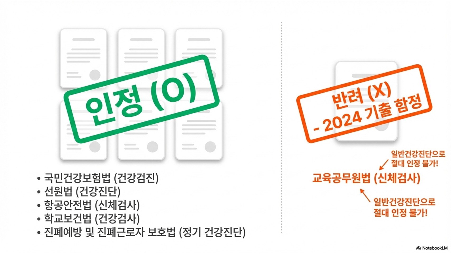 - 앞서 언급한 5가지 법령(국건법, 선원법, 항공법, 학교법, 진폐법) 외에 **'교육공무원법'**이나 일반적인 **'공무원법'**은 인정 대상이 아닙니다. 2024년 기출 함정이니 2026년에도 주의하십시오.