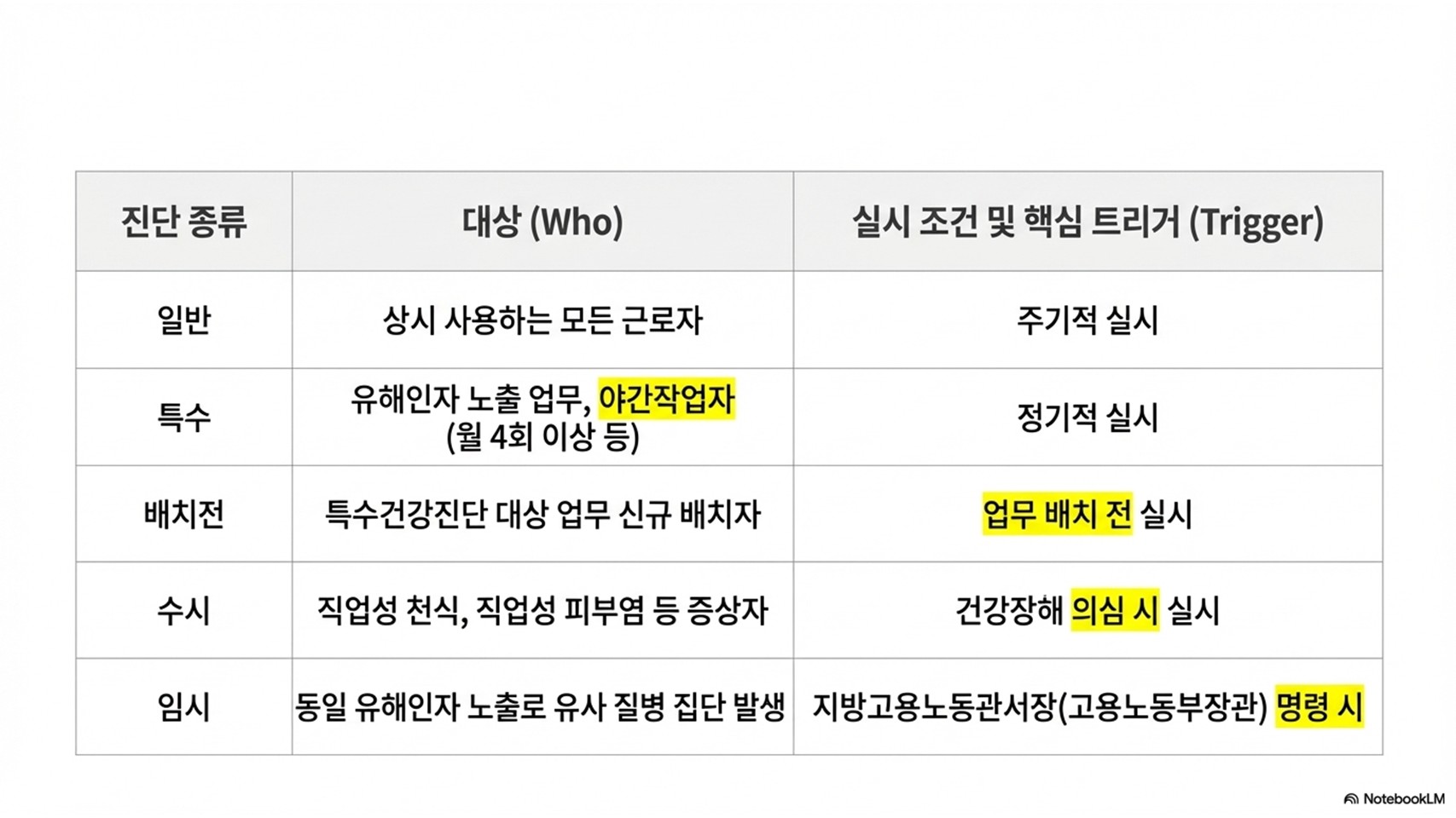 - 임시건강진단: 동일 유해인자 노출 근로자들에게 유사 질병이 집단 발생 시, **지방고용노동관서의 장(고용노동부장관)**의 명령에 따라 실시합니다.