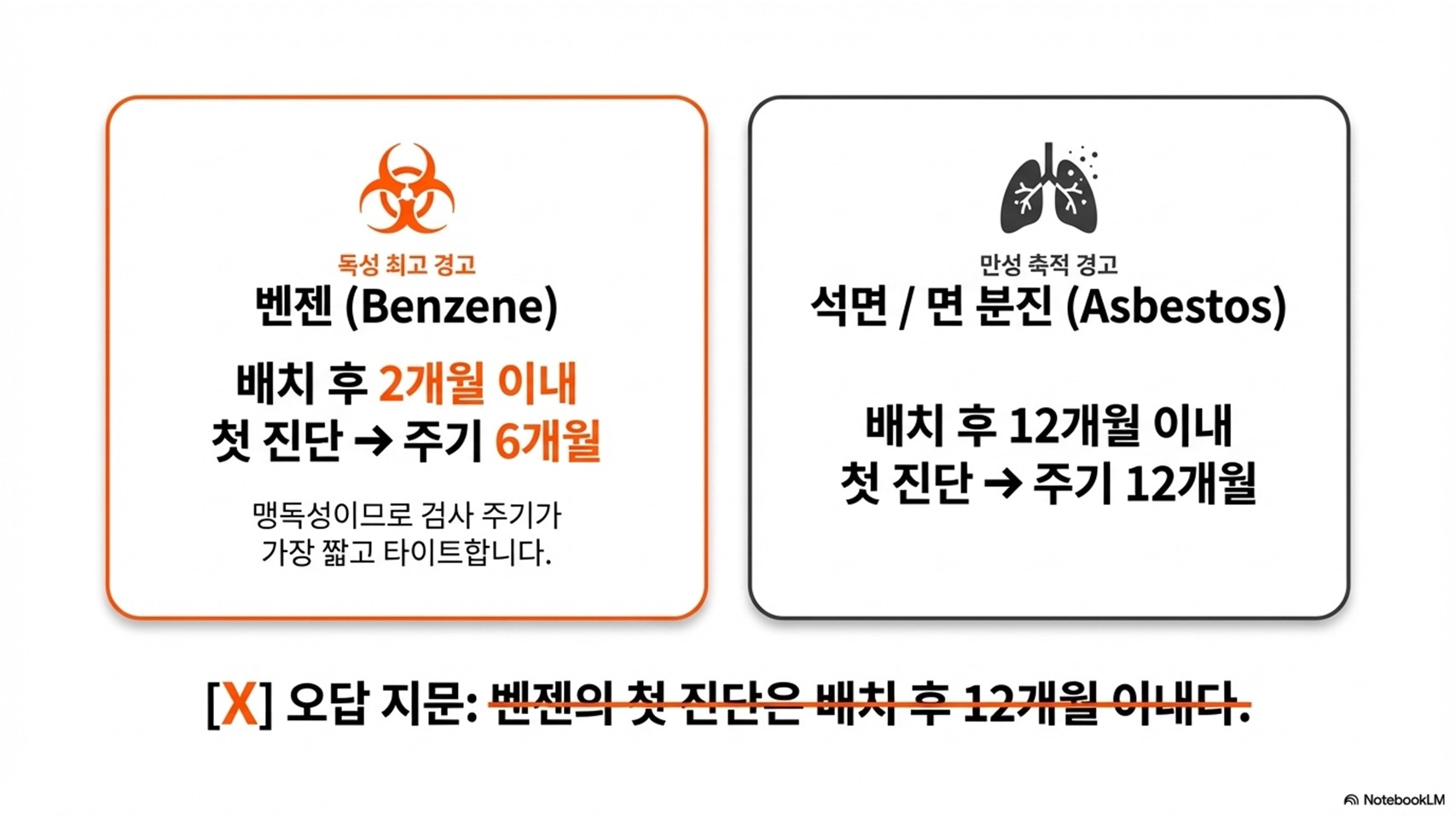 이 섹션은 숫자 싸움입니다. 특히 벤젠과 석면의 주기 차이는 매년 출제되는 단골 소재이므로 반드시 별표를 세 개 치고 암기하십시오.