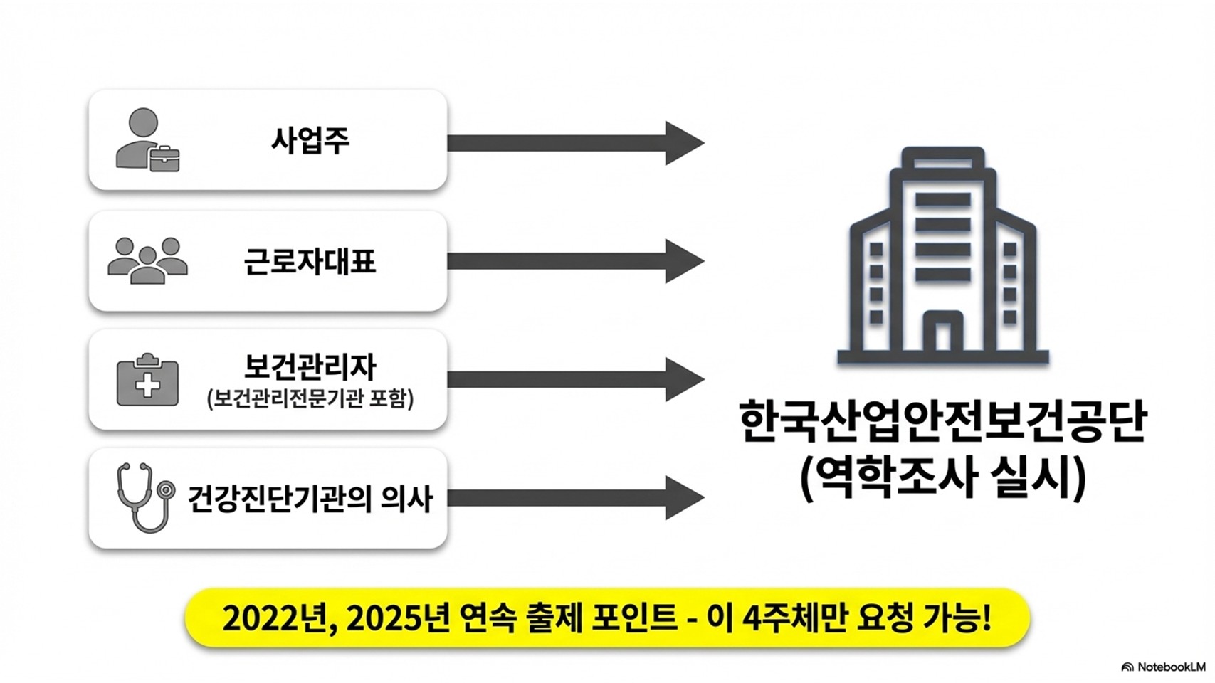 - **'역학조사평가위원회 위원장'**이나 **'산업안전보건위원회 위원장'**은 요청권자가 아닙니다. 위원장이라는 직책이 나오면 100% 함정입니다.