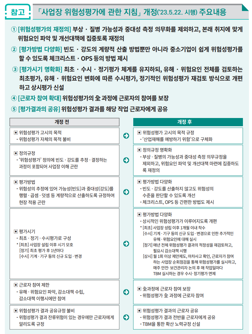 1. '23년 주요개정현황 위험성 추정 중심의 위험성평가를 파악과 참여.공유중심으로 재정의하고, 위험성 결정을 쉽고 간편하게 현실화. 최초 위험성평가의 시기를 명확히 하고, 정기평가의 부담 경감 유해.위험요인이 수시로 변동하는 사업장을 위한 월,주,일 단위의 상기 평가제도 신설 위험성평가 전체 단계에서 근로자 참여 보장. 위험성평가 효과를 극대화하기 위해 모든 근로자에게 위험성 평가 공유, 작업전 안전점검회의(TBM)를 통해 상시적으로 주지 교육. 항 목 변경전 변경후 1. 위험성평가를 쉽게 재정의 위헝성평가의 정의에[ 재해가 일어날 가능성(빈도)과 중대성(강도)을 추정,결정하는 과정의 어려움 부상,질병의 가능성과 중대성을 계량적으로 추정,결정하는 문구를 삭제하고, 위험요인의 파악과 개선 대책 마련에 집..