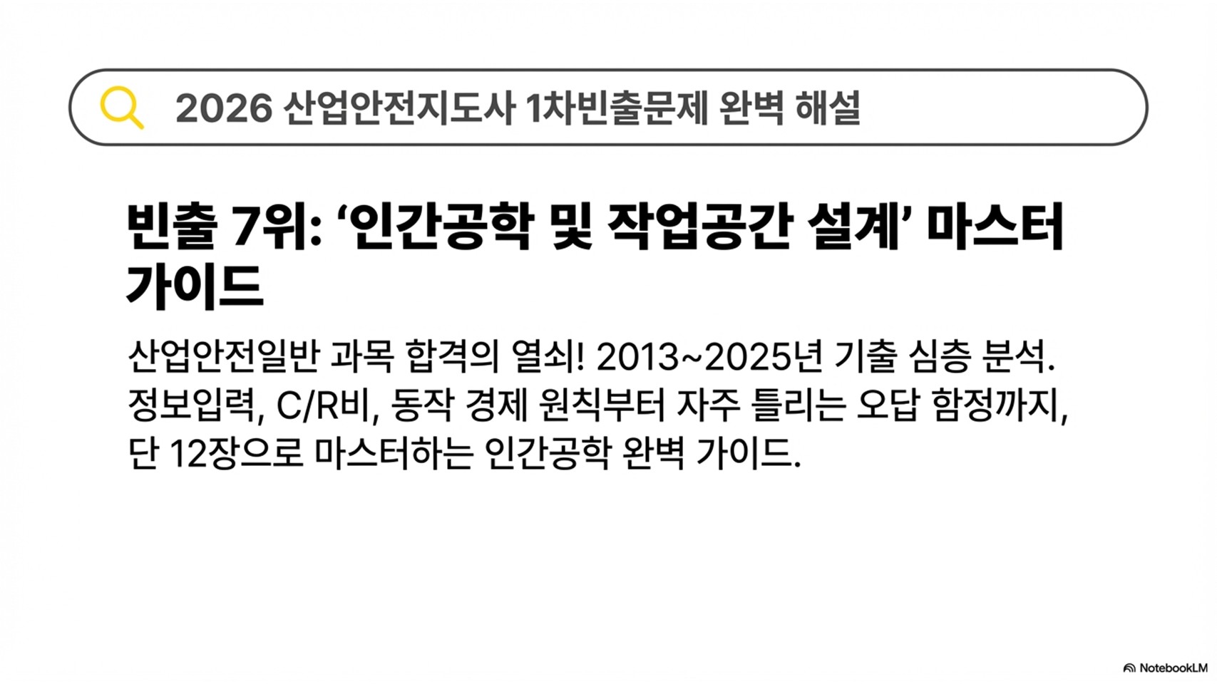 2026년 산업안전지도사 1차 합격 전략: 빈출 5위 '작업환경측정 및 근로환경 개선' 완벽 정리산업안전지도사 1차 시험 빈출 5위! 작업환경측정 원칙, 시료채취 방법, 측정기관 지정 요건 및 단골 오답 함정까지 2013~2025년 기출 데이터를 바탕으로 완벽하게 정리해 드립니다.--------------------------------------------------------------------------------1. 서론: 왜 '작업환경측정' 파트가 합격의 열쇠인가?산업안전지도사 1차 시험(산업안전보건법령)에서 '작업환경측정 및 근로환경 개선' 파트는 단순한 공부 범위 중 하나가 아닙니다. 이곳은 당신의 합격을 결정짓는 **'손익분기점(Break-Even Point)'**입니다.2013년부터 2..