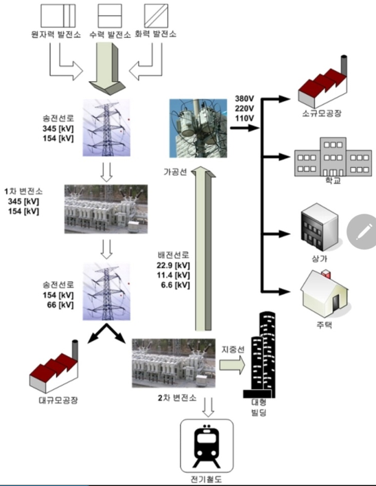 66,000KV~220V를 배전계통이라 부른다.