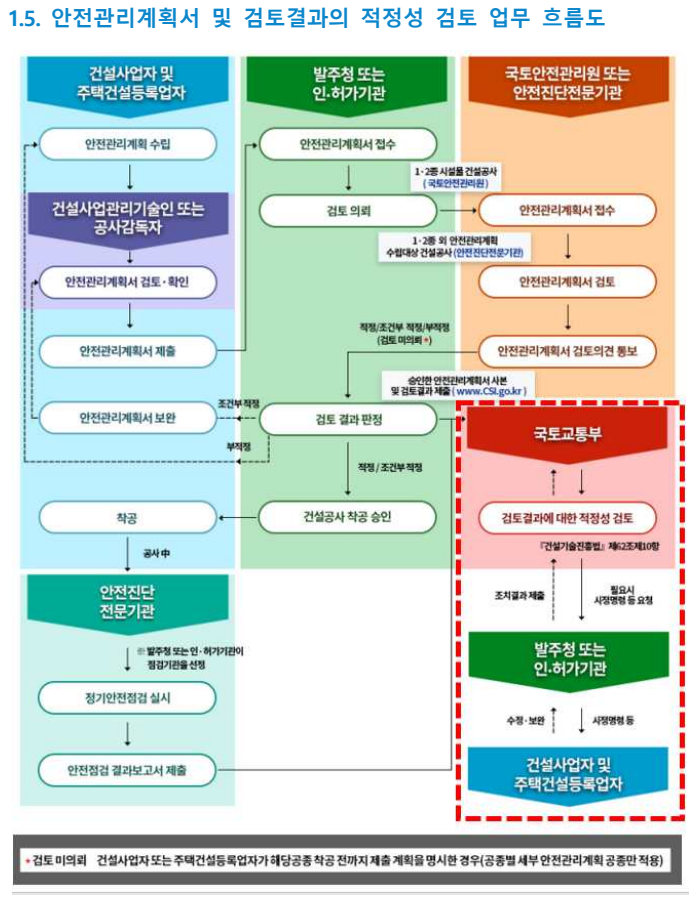 안전관리계획서 및 검토결과 제출의 적정성 검토는 「건설기술 진흥법」 제62조제10항 및 「건설기술 진흥법 시행령」 제98조제8항, 제9항에 따라 시행되고 있습니다.