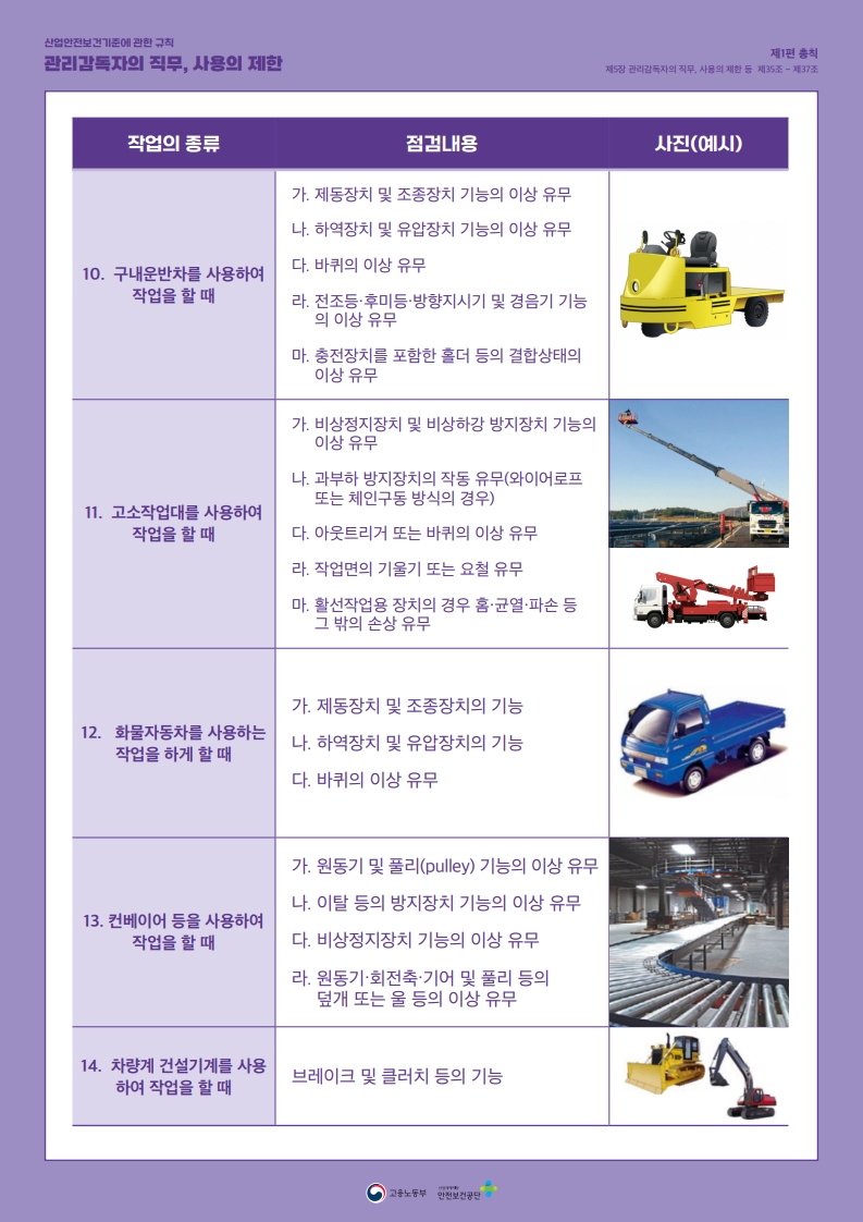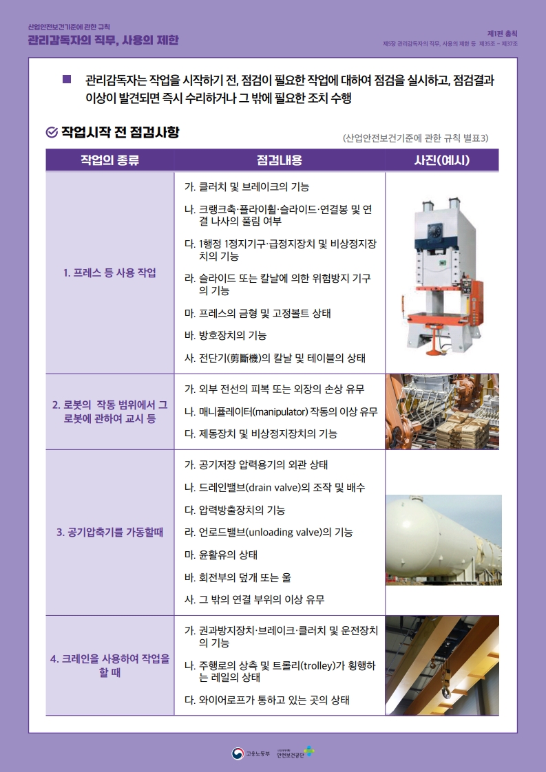 작업 시작 전에 관리감독자는 작업 환경의 안전성을 철저히 점검해야 합니다. 이는 기계, 기구, 설비의 이상 유무를 확인하고, 잠재적인 위험 요소를 사전에 파악하여 제거하는 과정입니다. 이러한 점검은 안전사고를 예방하는 데 필수적이며, 작업의 원활한 진행을 보장합니다.