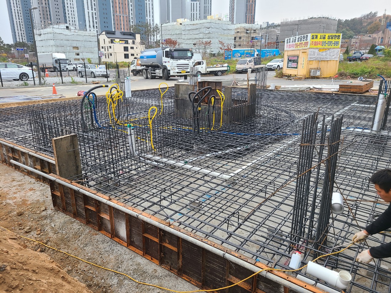 [사진설명 : 기초 버림콘크리트 타설후 기초 철근배근 및 전기 설비 배관 시공 ]