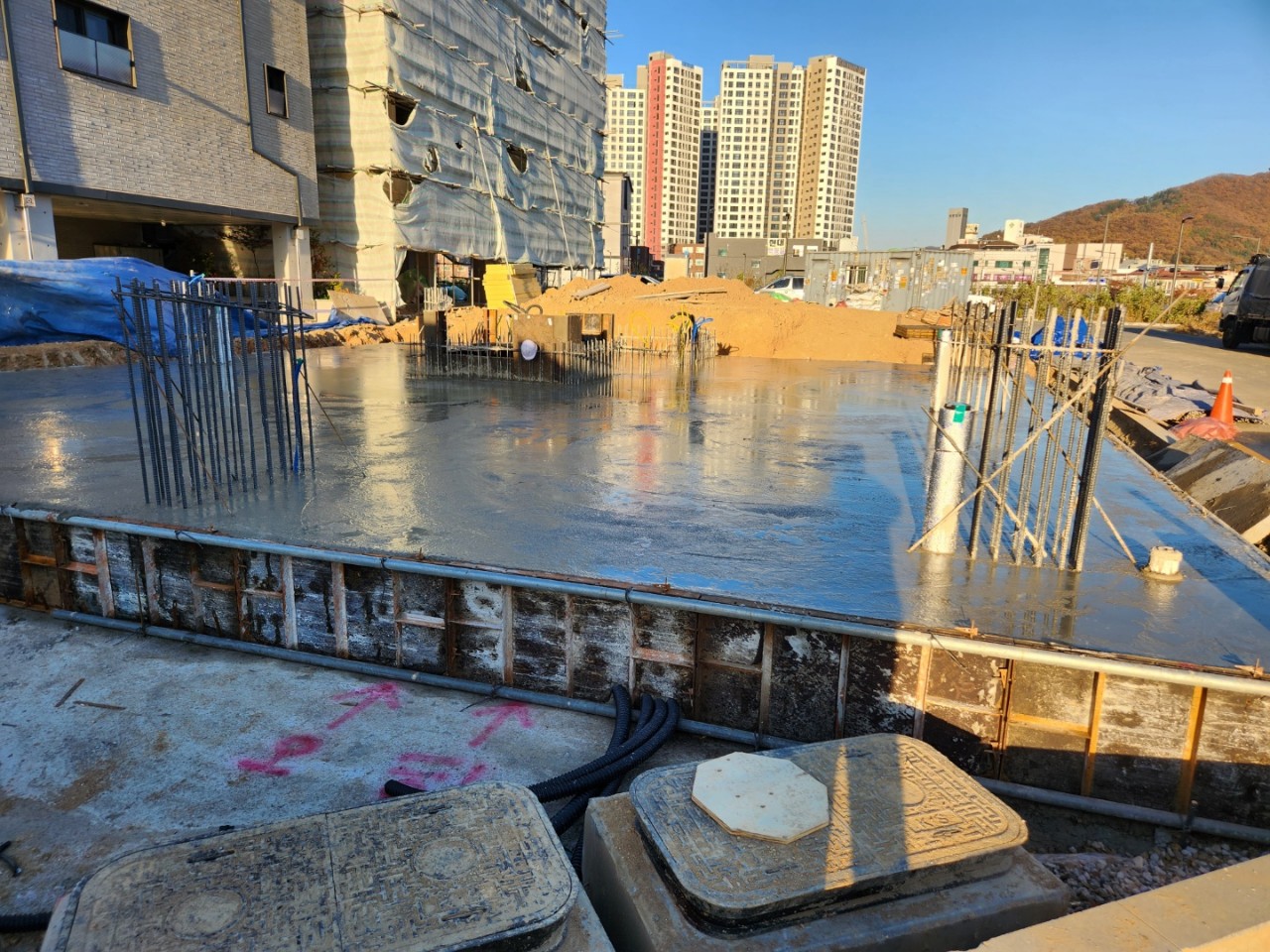[사진설명 : 기초 철근배근 및 전기 설비 배관 시공 후 기초 콘크리트 타설 ]