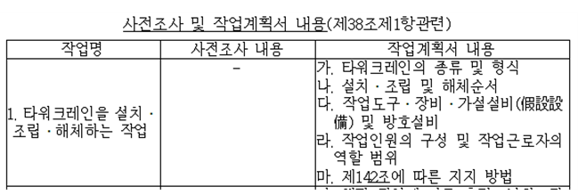 산업안전보건기준에 관한 규칙 제38조 사전조사 및 작업계획서의 작성등 ① 사업주는 다음 각 호의 작업을 하는 경우 근로자의 위험을 방지하기 위하여 별표 4에 따라 해당 작업, 작업장의 지형ㆍ지반 및 지층 상태 등에 대한 사전조사를 하고 그 결과를 기록ㆍ보존하여야 하며, 조사결과를 고려하여 별표 4의 구분에 따른 사항을 포함한 작업계획서를 작성하고 그 계획에 따라 작업을 하도록 하여야 한다. 1. 타워크레인을 설치ㆍ조립ㆍ해체하는 작업 2. 차량계 하역운반기계등을 사용하는 작업(화물자동차를 사용하는 도로상의 주행작업은 제외한다. 이하 같다) 3. 차량계 건설기계를 사용하는 작업 4. 화학설비와 그 부속설비를 사용하는 작업 |
