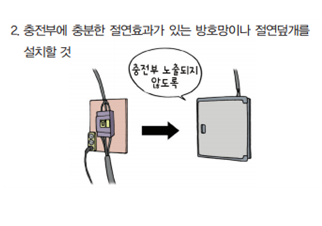 | ① : 충전부가 노출되지 않도록 폐[쇄형 외함 이있는 구조로 할것 ② : 충전부에 충분한 절연효과가 있는 방호망이나 절연덮개를 설치할것 ③ : 충전부는 내구성이 있는 절연물로 완전히 덮어 감쌀것 |