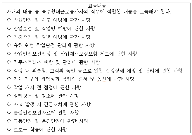 | 산업안전보건법 시행규칙 별표 5 4. 특수형태근로종사자에 대한 안전보건교육(제95조제1항 관련) 가. 최초 노무제공 시 교육 ![]() |