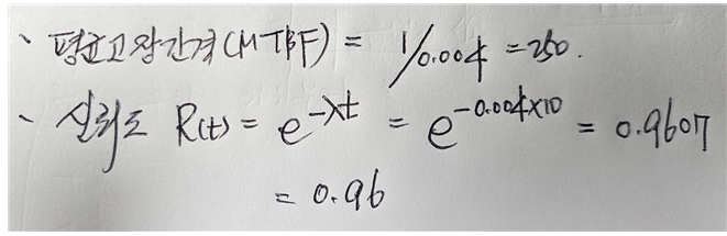 A 부품의 신뢰도는 지수분포를 따르고 있다. 고장륭이 시간당 0.004일 때, A부품의 평균고장간격(MTBF)10시간 사용했을 때 신뢰도를 구하시오.