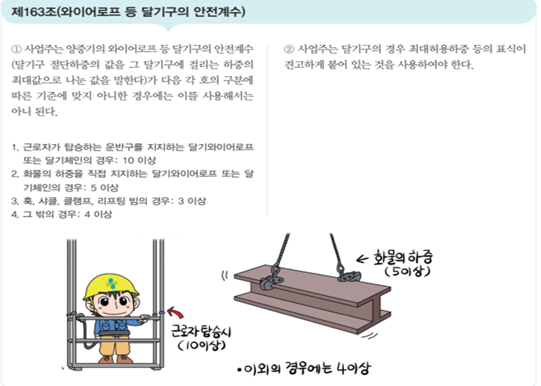 | 근로자가 탑승하는 운반구를 지지하는 달이와이어로프 또는 달기체인의 경우 : (① ) 이상 화물의 하중을 직접 지지하는 달이 와이어로프 또는 달기체인의 경우 : (② ) 이상 훅,사클,클램프,리프팅 빔의 경우 : ( ③ ) 이상 그밖의 경우 :4이상 |