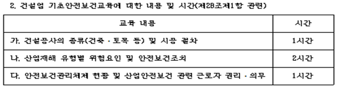 | 산업안전보건법령상, 건설기초안전교육의 내용 2가지를 쓰시오 |