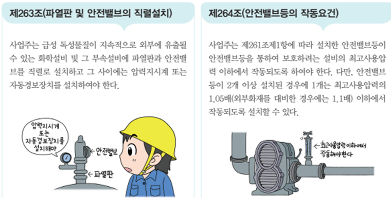 | ■ 문제 8. 산업안전보건법령상, 파열판 및 안전밸브 설치 및 작동요건과 관련하여 ( )에 알맞은 것을 쓰시오 |