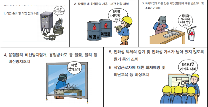 | ① : 작업 준비 및 작업 절차 수립 ② : 작업장 내 위험물의 사용ㆍ보관 현황 파악 ③ : 화기작업에 따른 인근 가연성물질에 대한 방호조치 및 소화기구 비치 |