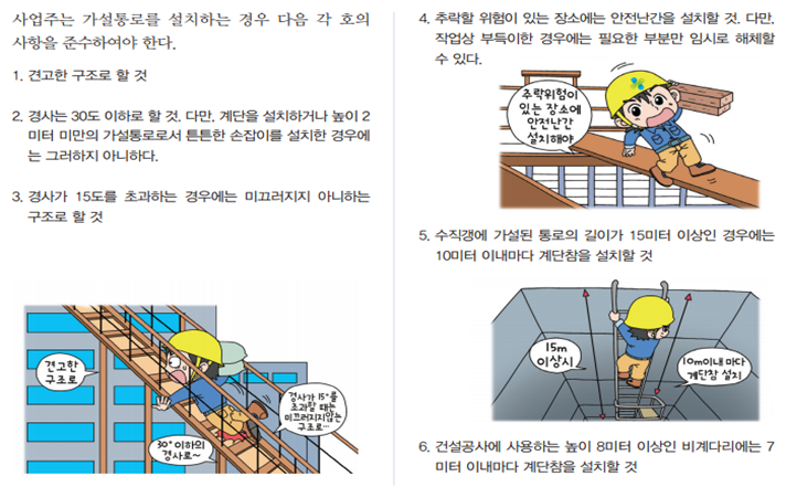 | 산업안전보건기준에 관한 규칙 제23조(가설통로의 구조) 사업주는 가설통로를 설치하는 경우 다음 각 호의 사항을 준수하여야 한다. 1. 견고한 구조로 할 것 2. 경사는 30도 이하로 할 것. 다만, 계단을 설치하거나 높이 2미터 미만의 가설통로로서 튼튼한 손잡이를 설치한 경우에는 그러하지 아니하다. 3. 경사가 15도를 초과하는 경우에는 미끄러지지 아니하는 구조로 할 것 4. 추락할 위험이 있는 장소에는 안전난간을 설치할 것. 다만, 작업상 부득이한 경우에는 필요한 부분만 임시로 해체할 수 있다. 5. 수직갱에 가설된 통로의 길이가 15미터 이상인 경우에는 10미터 이내마다 계단참을 설치할 것 6. 건설공사에 사용하는 높이 8미터 이상인 비계다리에는 7미터 이내마다 계단참을 설치할 것 |
