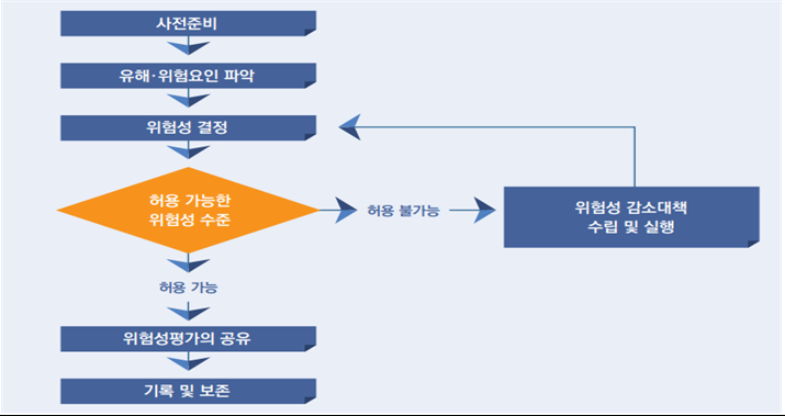 | ① : 사전준비 ② : 유해.위험요인의 파악 ③ : 위험성 결정 ④ : 위험성감소대책 수립 및 실행 ⑤ : 위험성평가 실시내용 및 결과에 관한 기록 및 보존 |
