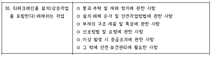 | ① : 붕괴.추락 및 재해방지에 관한 사항 ② : 설치.해체 순서 및 안전작업방법에 관한 사항 ③ : 부재의 구조,재질 및 특성에 관한사항 ④ : 신호방법 및 요령에 관한 사항 ⑤ : 이상 발생시 응급조치에 관한 사항 |