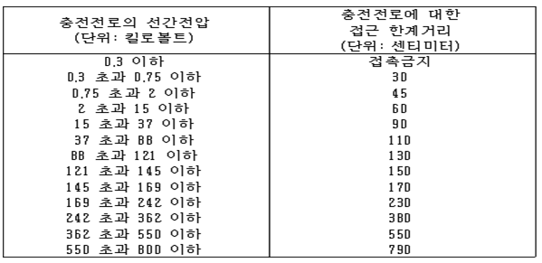 | 산업안전보건기준에 관한 규칙 제321조(충전전로에서의 전기작업) 8. 유자격자가 충전전로 인근에서 작업하는 경우에는 다음 각 목의 경우를 제외하고는 노출 충전부에 다음 표에 제시된 접근한계거리 이내로 접근하거나 절연 손잡이가 없는 도전체에 접근할 수 없도록 할 것 가. 근로자가 노출 충전부로부터 절연된 경우 또는 해당 전압에 적합한 절연장갑을 착용한 경우 나. 노출 충전부가 다른 전위를 갖는 도전체 또는 근로자와 절연된 경우 다. 근로자가 다른 전위를 갖는 모든 도전체로부터 절연된 경우 ![]() |