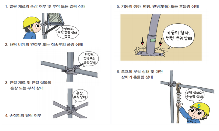 산업안전보건기준에 관한 규칙 제58조(비계의 점검 및 보수) 사업주는 비, 눈, 그 밖의 기상상태의 악화로 작업을 중지시킨 후 또는 비계를 조립ㆍ해체하거나 변경한 후에 그 비계에서 작업을 하는 경우에는 해당 작업을 시작하기 전에 다음 각 호의 사항을 점검하고, 이상을 발견하면 즉시 보수하여야 한다. 1. 발판 재료의 손상 여부 및 부착 또는 걸림 상태 2. 해당 비계의 연결부 또는 접속부의 풀림 상태 3. 연결 재료 및 연결 철물의 손상 또는 부식 상태 4. 손잡이의 탈락 여부 5. 기둥의 침하, 변형, 변위(變位) 또는 흔들림 상태 6. 로프의 부착 상태 및 매단 장치의 흔들림 상태 |