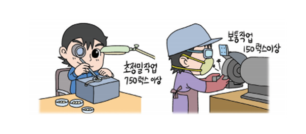 | 산업안전보건기준에 관한 규칙 제8조(조도) 사업주는 근로자가 상시 작업하는 장소의 작업면 조도(照度)를 다음 각 호의 기준에 맞도록 하여야 한다. 다만, 갱내(坑內) 작업장과 감광재료(感光材料)를 취급하는 작업장은 그러하지 아니하다. 1. 초정밀작업: 750럭스(lux) 이상 2. 정밀작업: 300럭스 이상 3. 보통작업: 150럭스 이상 4. 그 밖의 작업: 75럭스 이상 |