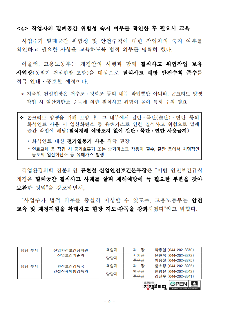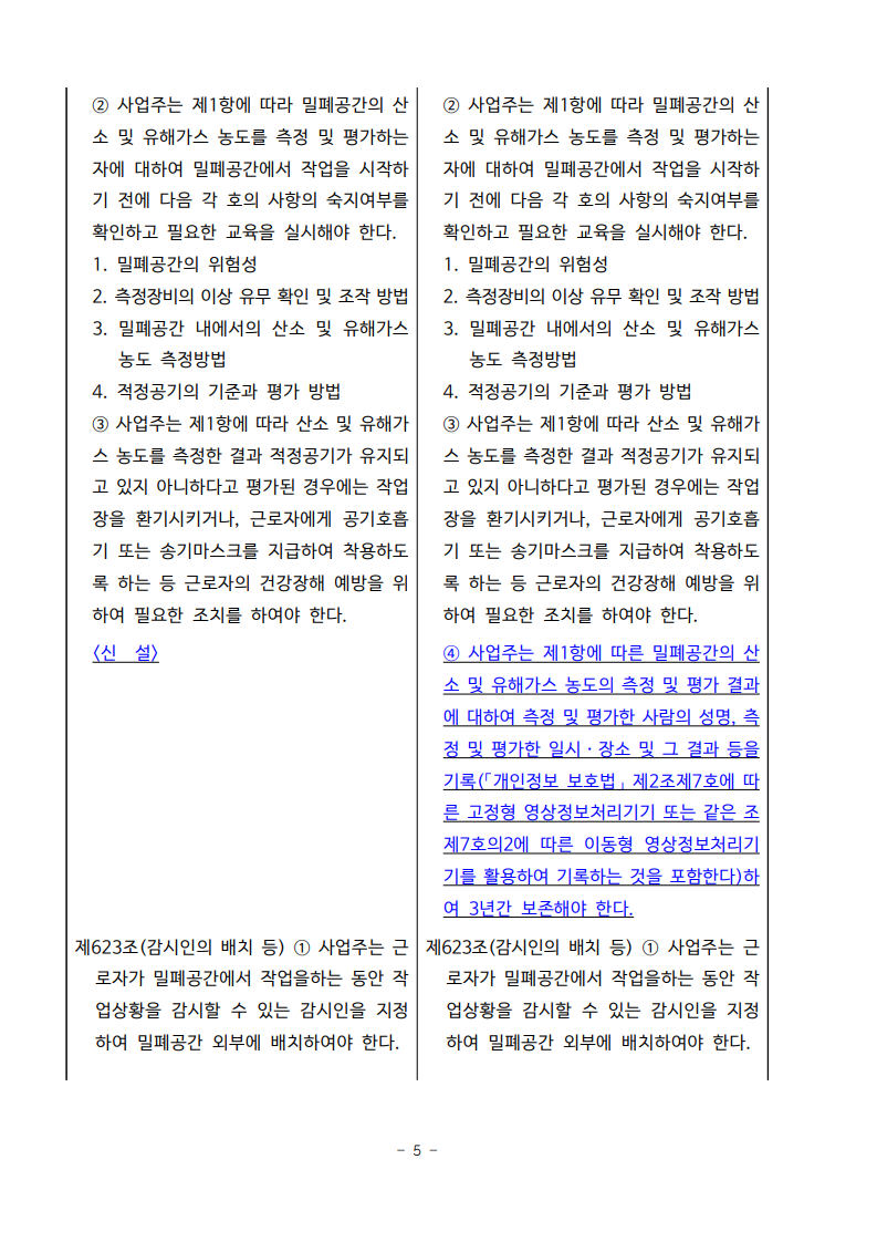ㅇ 개정내용은 현장에서 산소 및 유해가스 농도를 측정하고, 적정공기 여부를 확인 후 작업이 개시될 수 있도록 규정를 정비한 것으로