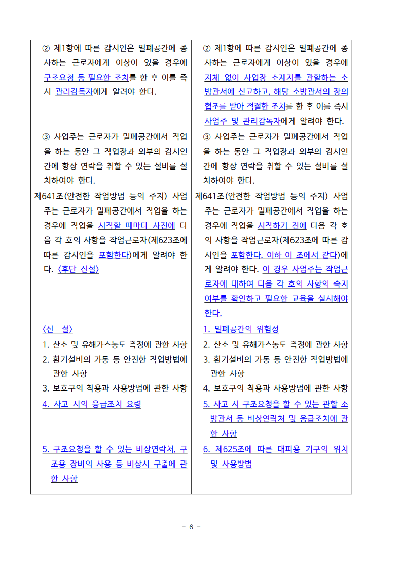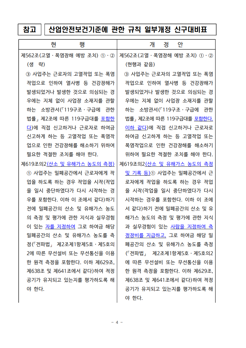 ㅇ 개정내용은 현장에서 산소 및 유해가스 농도를 측정하고, 적정공기 여부를 확인 후 작업이 개시될 수 있도록 규정를 정비한 것으로