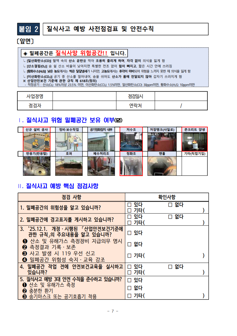 1) 작업 전 측정기 지급과 기록 등을 통해 실제 현장에서 산소 및 유해가스 농도 측정이 실시되는 것이 중요
