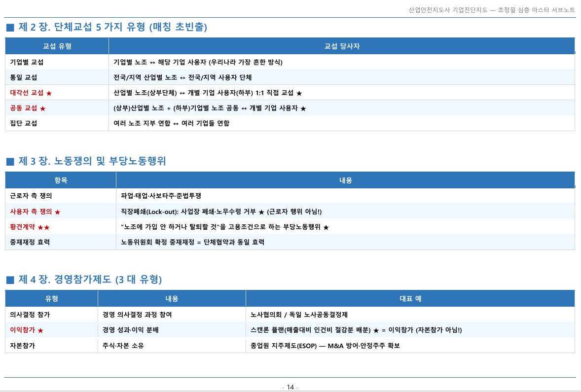 - 분쟁 관련: 단체교섭의 유형, 사용자의 부당노동행위(황견계약 등), 노동쟁의조정 방식 등이 반복 출제됩니다 3.