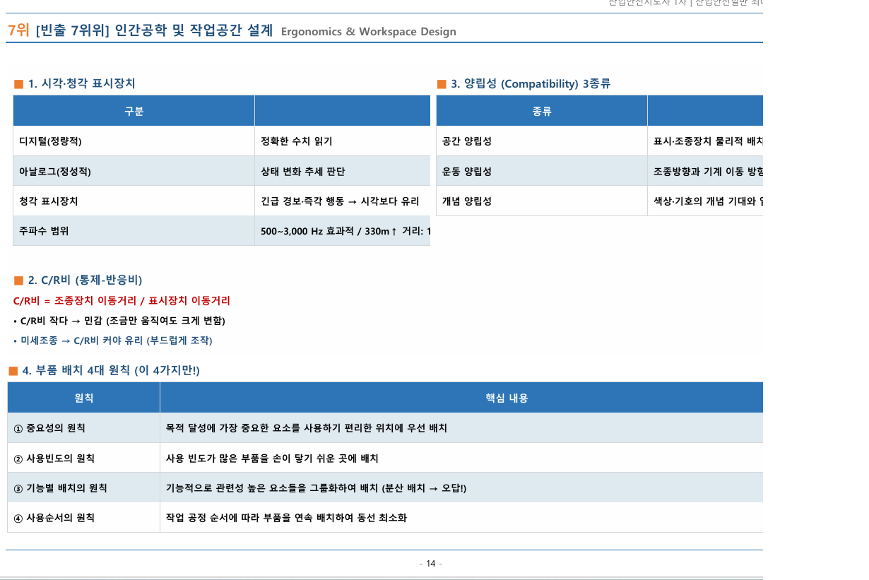 - 조종 및 표시장치: 시각 및 청각 등 정보입력 표시장치의 특성, C/R비(통제-반응비) 계산, 그리고 공간 및 운동 양립성의 원칙이 출제됩니다 4.