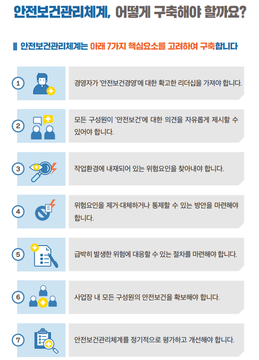 안전보건관리체계 구축이란 중대재해처벌법 제 4조(사업주와 경영책임자등의 안전 및 보건 확보의무) 1호에 의거하면 사업주 또는 경영책임자등은 사업주나 법인 또는 기관이 실질적으로 지배,운영관리 하는 사업 또는 사업장에서 종사자의 안전 보건상 유해 위험 또는 위험을 방지하기 위하여 그 사업 또는 사업장의 특성 및 규모등을 고려하여 다음 각호의 조치를 하여야 한다.