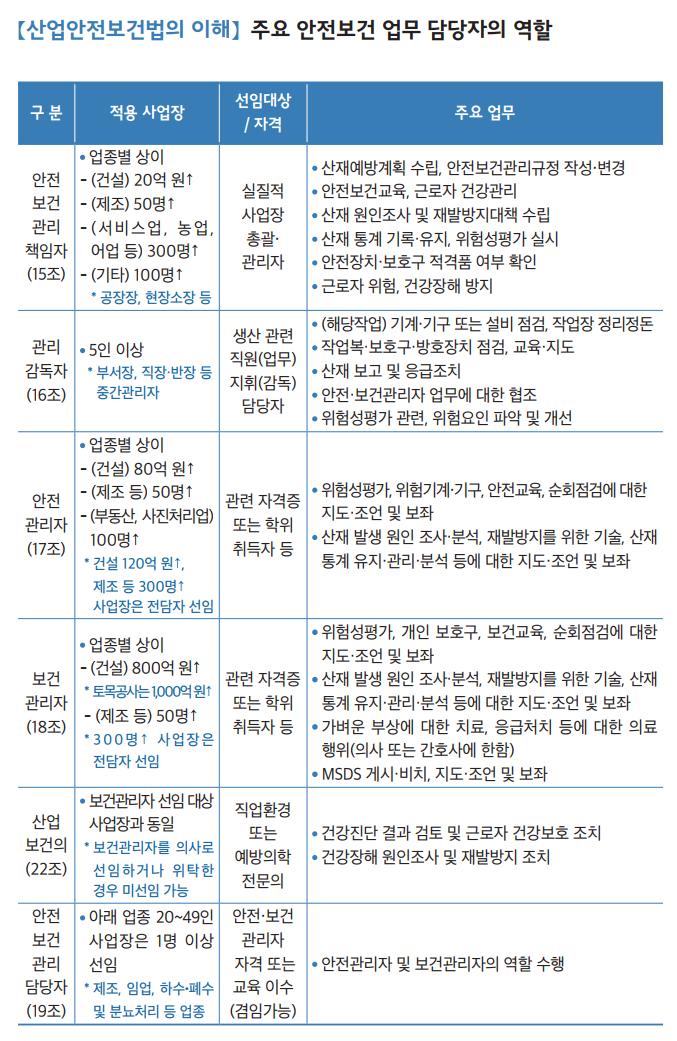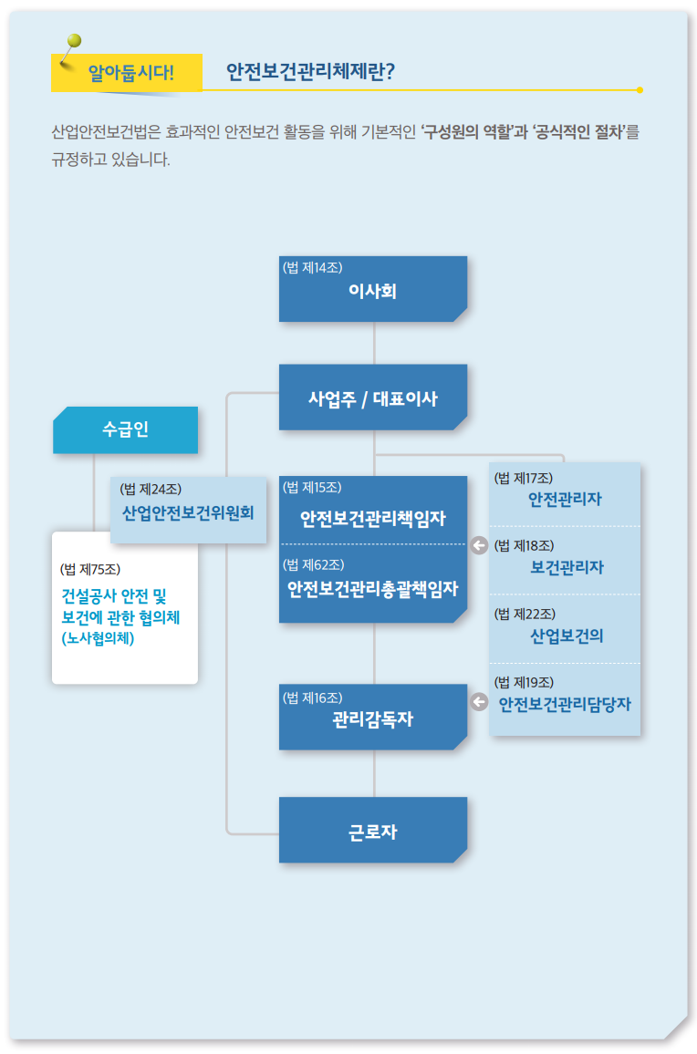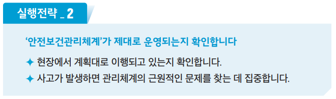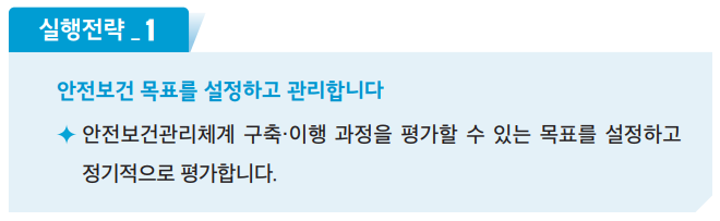 - 경영자 : 경영자가 '안전보건경영'에 대한 확고한 리더십을 가져야 합니다
