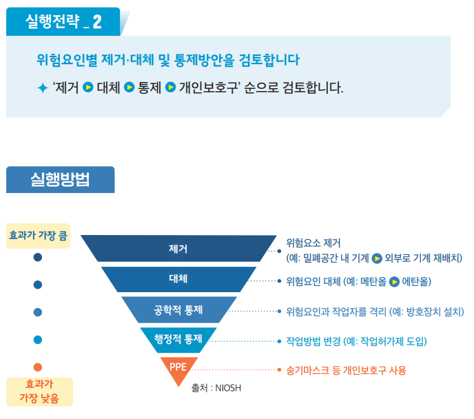 - 유해위험요인제거.대체 및 통제 : 유해위험요인을 제거,대체하거나 통제할수 있는 방안을 마련해야 합니다.