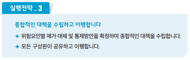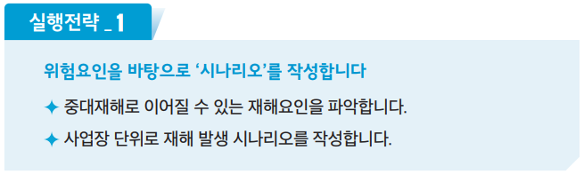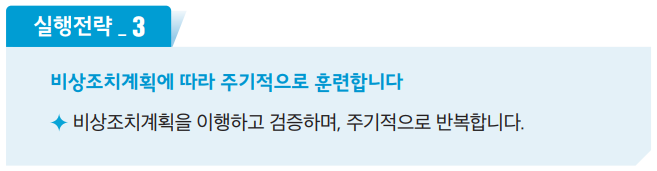 - 비상조치.시나리오 : 급박한 위험에 대응할수 있는 절차 및 시나리오를 마련해야 합니다.