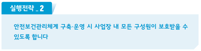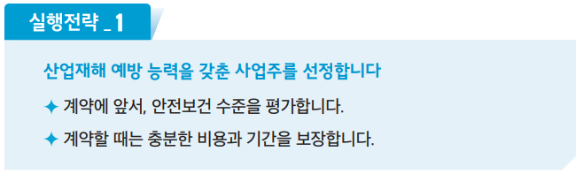 - 도급.용역.위탁 대책 : 사업장내 모든 구성원의 안전보건을 확보해야 합니다.