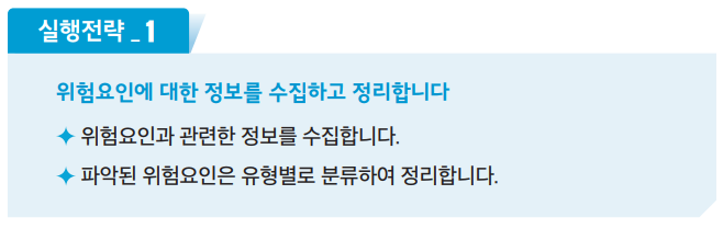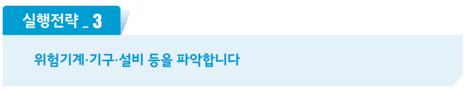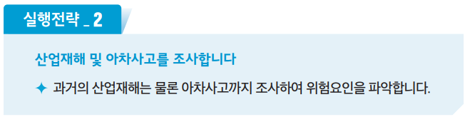 - 유해위험요인파악 : 작업환경에 내재되어 있는 위험요인을 찾아내야 합니다.