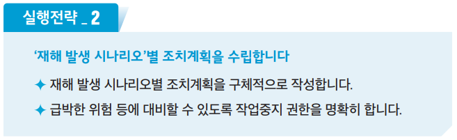 - 비상조치.시나리오 : 급박한 위험에 대응할수 있는 절차 및 시나리오를 마련해야 합니다.