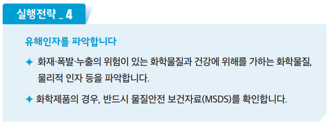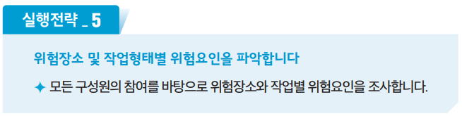 - 유해위험요인파악 : 작업환경에 내재되어 있는 위험요인을 찾아내야 합니다.