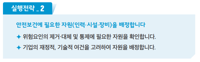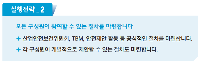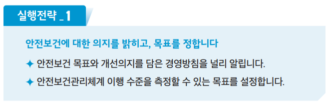 - 경영자 : 경영자가 '안전보건경영'에 대한 확고한 리더십을 가져야 합니다
