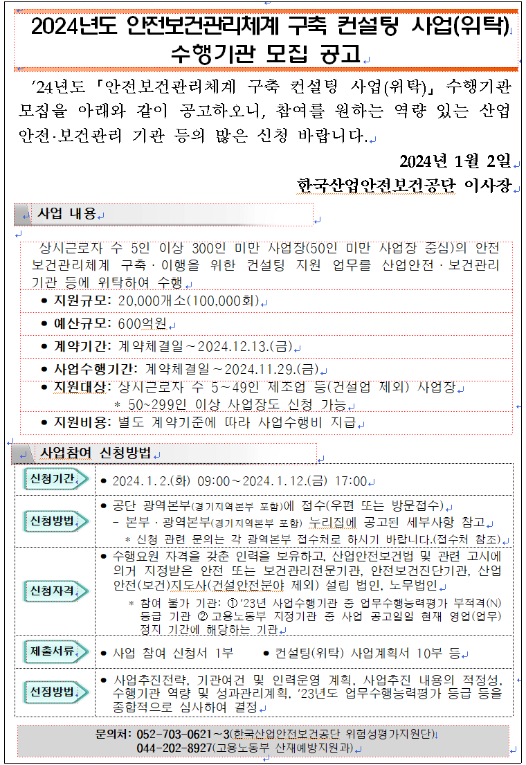 2024년도 안전보건관리체계 구축 컨설팅 사업 수행기관 모집공고