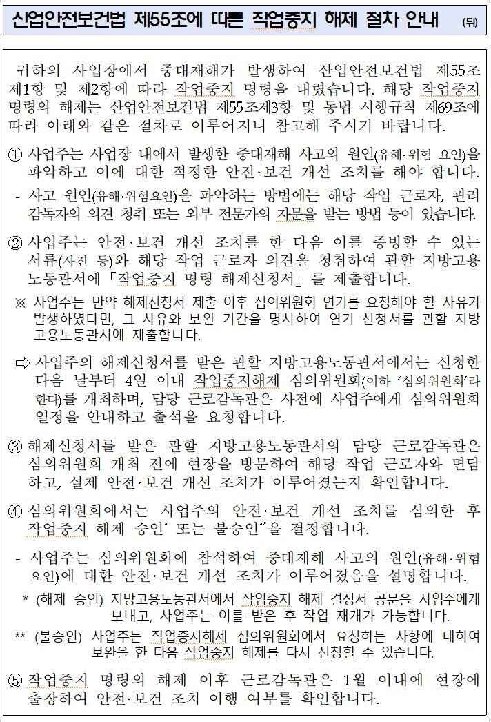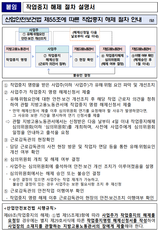 노동부는 안전보건개선계획서를 검토후 작업중지해체 심의위원회를 통하여 작업중지 해제 검토후 조치가 적정한 경후 작업중지를 해제시킨다.