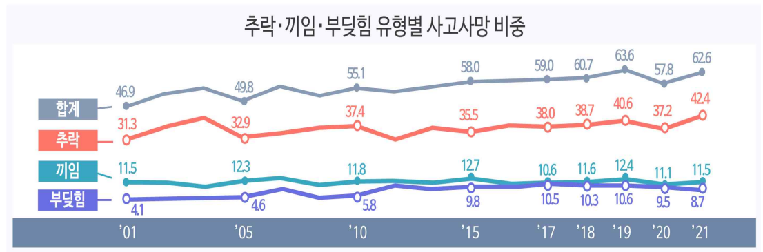 - 매년 800명 이상 사고로 사망 > 8년때 만인율이 0.4~0.5%%수준에서 정체