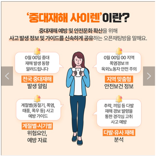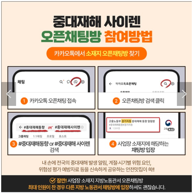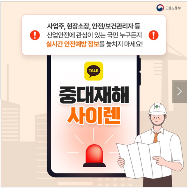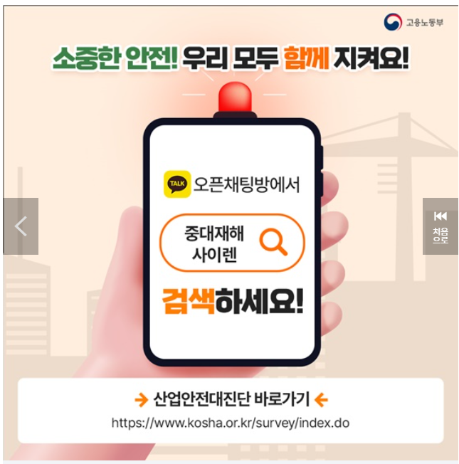 '중대재해 사이렌'이란 중대재해 예방 및 안전문화 확산을 위해 고용노동부에서 운영하는 카카오톡 오픈 채팅방을 말한다. 사고발생 정보 및 가이드를 신속하게 제공하고 있다.