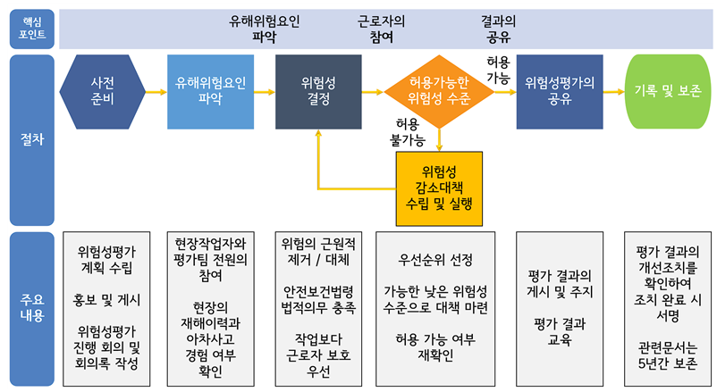 사업주가 스스로 사업장내의 원재료, 가스 ,증기, 분진등 (이하 "화학물질" 이라함) 에 의한 유해 위험요인을 찾아내고,  해당 유해위험요인의 위험성 수준을 결정하여 , 위험성을 낮추기 위한 적절한 조치를 마련하고 실행하는 과정을 말한다.