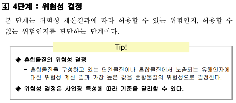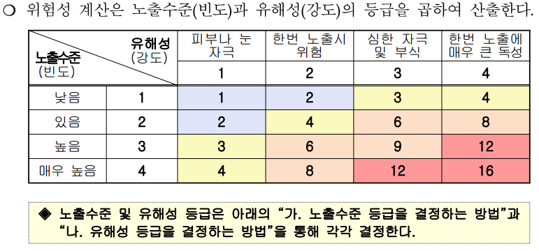 - :위험성"이란 근로자가 화학물질에 노출됨으로써 건강장해가 발생할 가능성(노출수준)과 건강에 영향을 주는 정도(유해성)의 조합을 말한다.