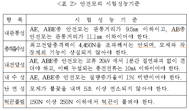 ☞ 보호구 안전인증고시 안전모의 시험성능기준은 표 2에 따른다. <표 2> 안전모의 시험성능기준 ![]() |